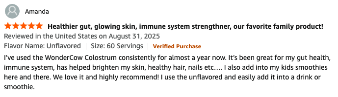 Try WonderCow Colostrum Powder for 30 days — completely RISK-FREE. If you don’t notice smoother skin, better digestion, more energy, and the confidence that comes with feeling younger…