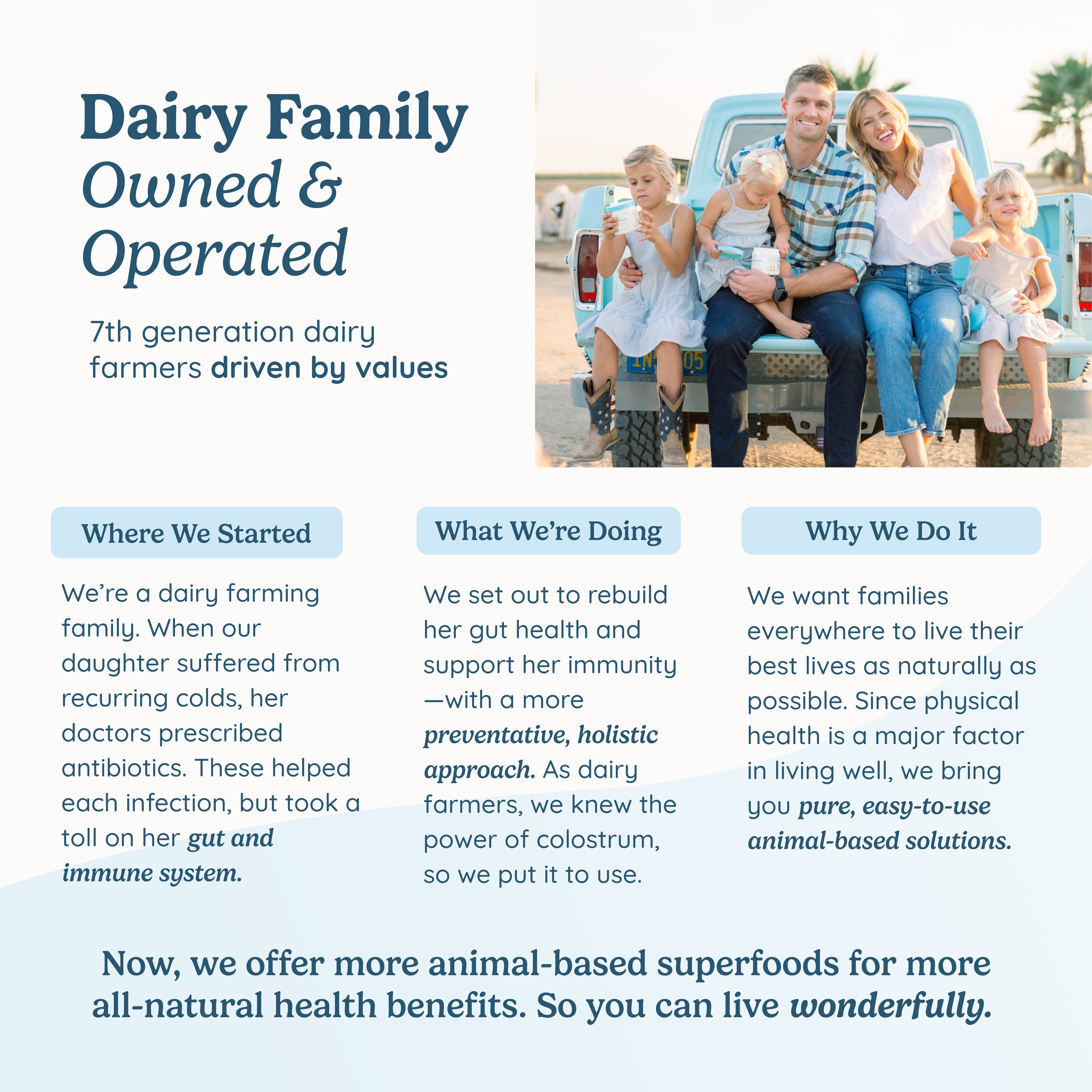 Family first, with seven generations of farming to back up why we love colostrum so much. The wellbeing of our cows is a top priority for us, as we raise our family with intention to work hard and use our gifts to help the world around us.